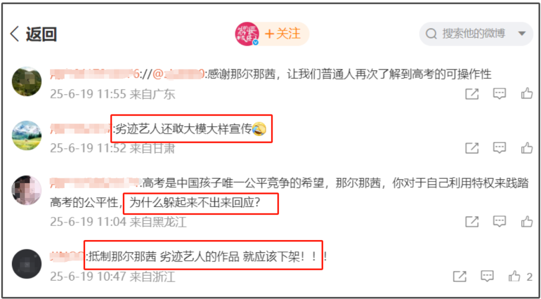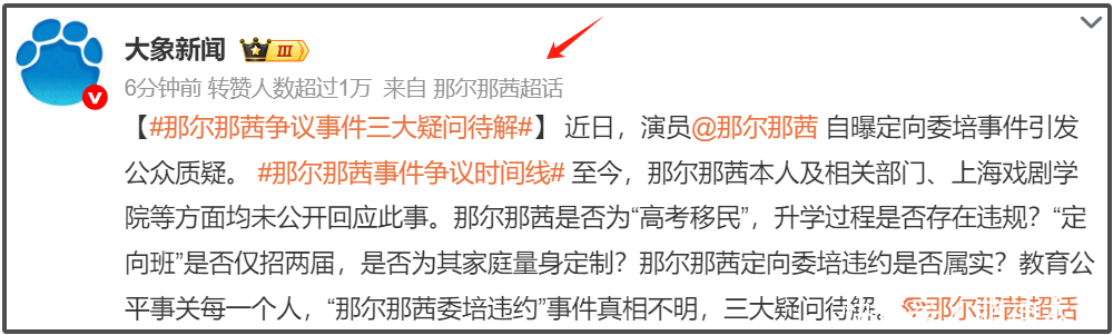 大象新闻作风最为矍铄,官博干脆把“那尔那茜争议事件三大疑问待解”话题发到了那尔那茜超话,直言请示公道事关每一个东谈主毁坏糟踏,条件那尔那茜恢复高考外侨、升学违法、量身定制上戏定向班等中枢争议,已有超万东谈主次转赞。