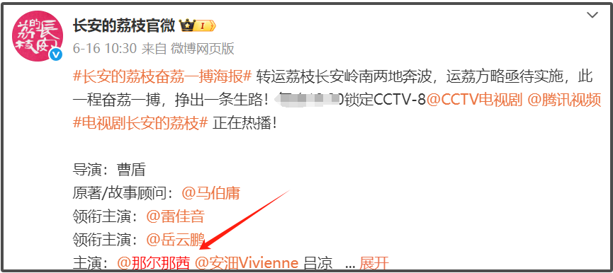 剧版《长安的荔枝》由雷捷报、岳云鹏主演,那尔那茜在其中演出一个原创脚色,早早被质疑加戏,番位更是排在第三,仅次于雷捷报和岳云鹏。