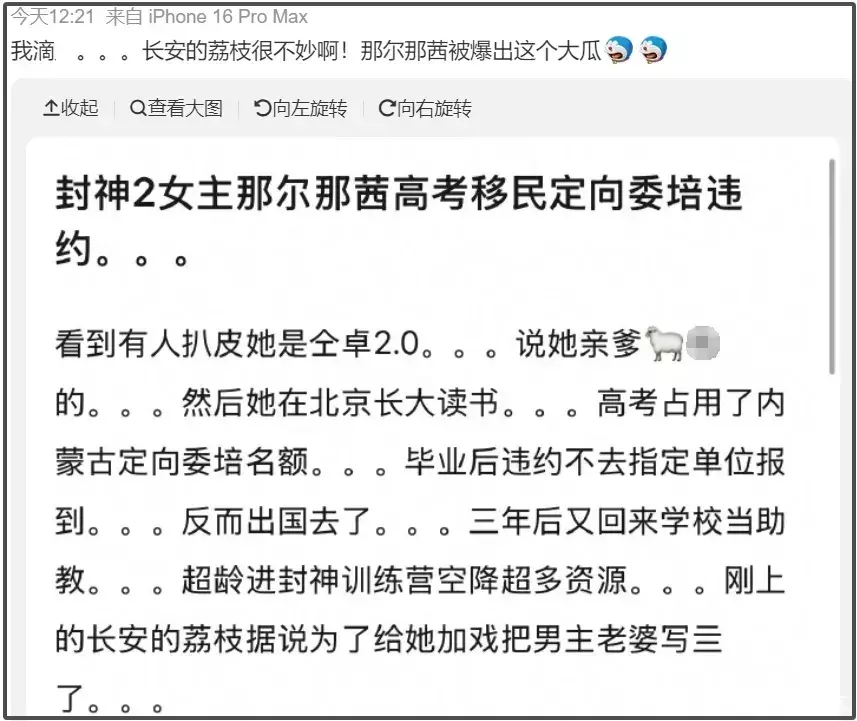随后网友扒出那尔那茜不光委培失约,还疑似高考外侨、违法升学,号称内娱董姑娘,更令东谈主敌对的是那尔那茜的作风。