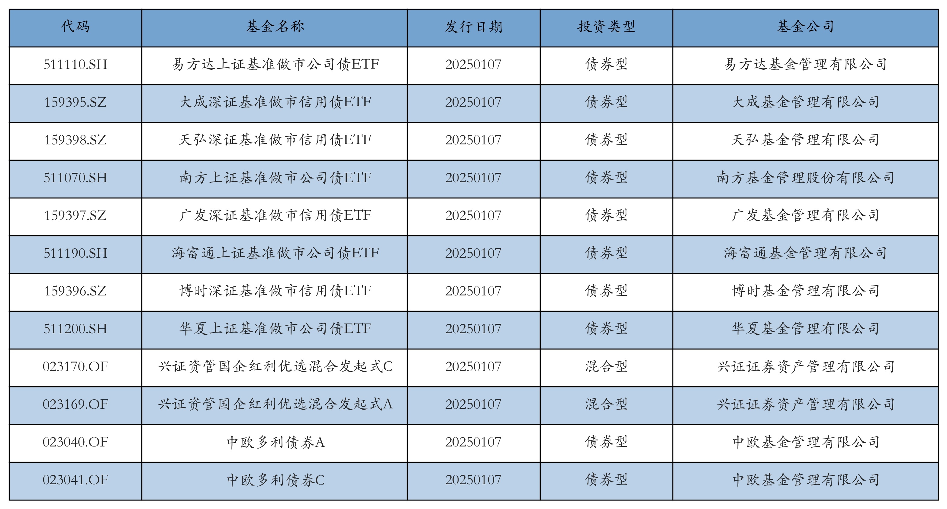 昨日有12只新基金刊行,分手为:易方达上证基准作念市公司债ETF、大成深证基准作念市信用债ETF、天弘深证基准作念市信用债ETF、南边上证基准作念市公司债ETF、广发深证基准作念市信用债ETF、海富通上证基准作念市公司债ETF、博时深证基准作念市信用债ETF、中原上证基准作念市公司债ETF、兴证资管国企红利优选搀和发起式C、兴证资管国企红利优选搀和发起式A、中欧多利债券A、中欧多利债券C,笃定见下表: