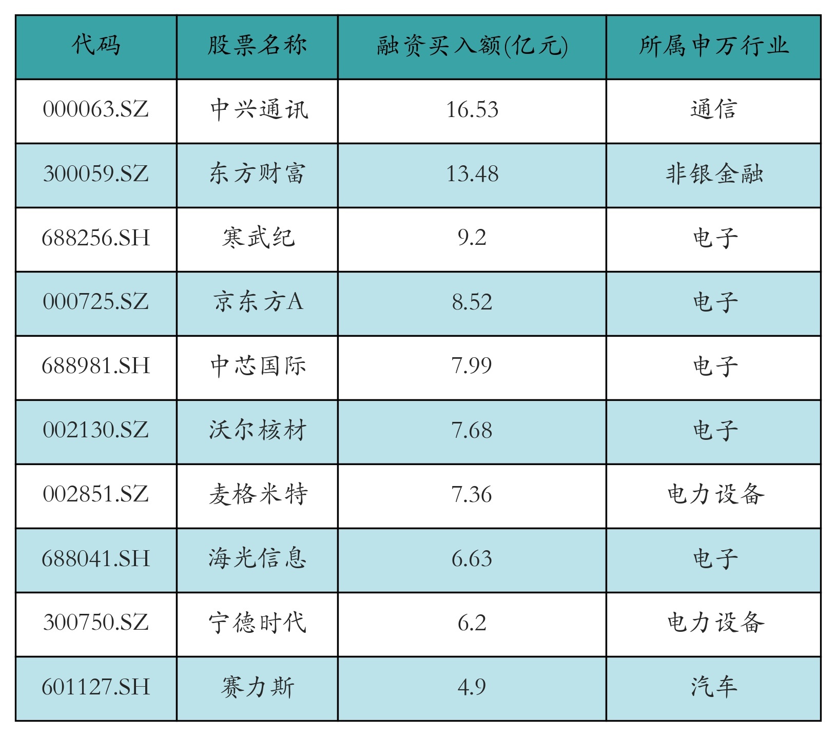 两市共有3392只个股有融资资金买入,其中中兴通信、东方资产、寒武纪名次前三,买入金额分手16.53亿元、13.48亿元、9.2亿元。融资买入额前10个股笃定见下表: