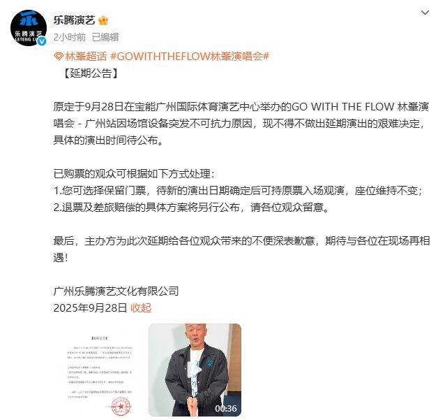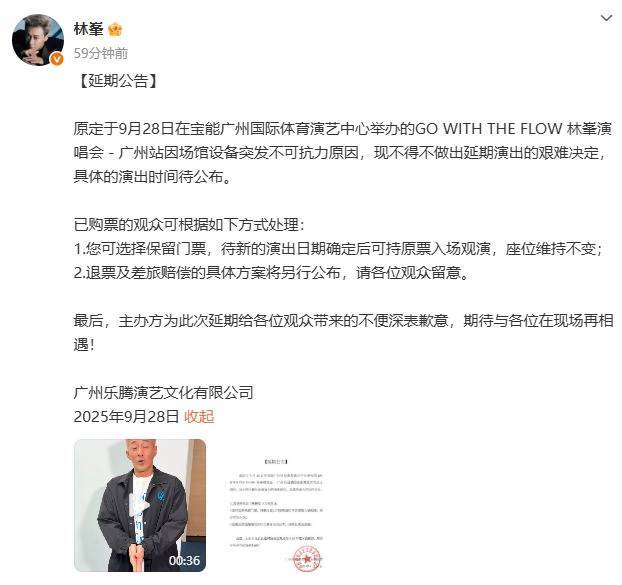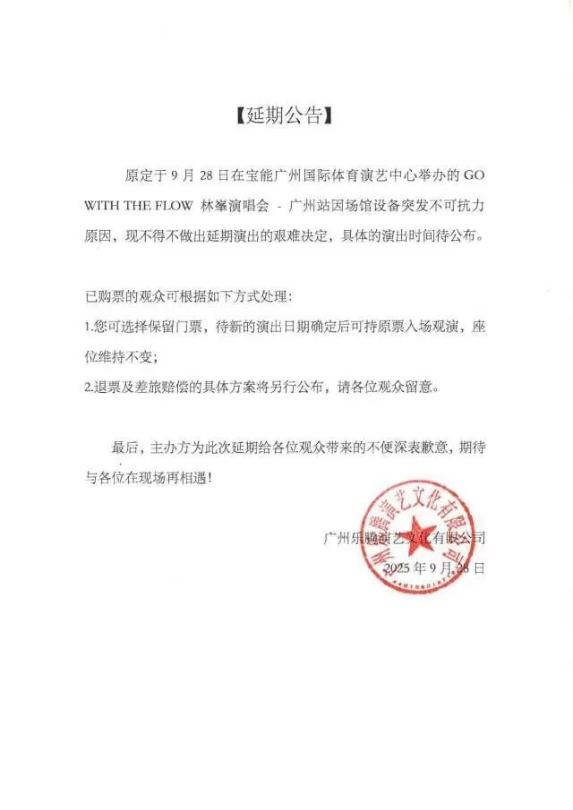 9月28日17时24分开yun体育网,广州乐腾演艺文化有限公司发布公告:原定于9月28日在宝能广州国外体育演艺中心举办的“GO WITH THE FLOW 林峯演唱会—广州站”因场馆诞生突发弗成抗力原因,现不得不作念出展期上演的深奥决定,具体的上演时分待公布。