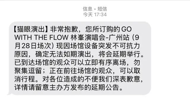 但9月28日的上演在开场前一个半小时临时文告展期,除主持方乐腾演艺发布公告外,猫眼、大麦等票务平台也向不雅众发出短信示知上演展期。与此同期,有如故到达宝能广州国外体育演艺中心的不雅众在酬酢平台上响应,场馆现场疑似发生失火,看到有消防车到场,并有消防员正在功课。