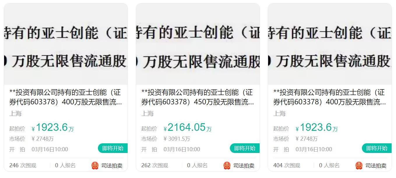 近日,“中国缔造节能与庇荫材料主板上市第一股”亚士创能发布公告称,公司控股鼓吹上海创能明投资有限公司(下称“创能明”)所握有的1250万股无尽售流畅股将被法令拍卖,占公司总股本的2.92%。鸿沟该公告显露日,上述拟法令拍卖股份均处于法令冻结现象。