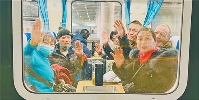 浙江宁波,游客们透过车窗顺心挥手。 刘 艳摄