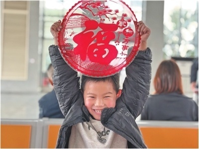 江西南昌,南昌西站的候车室内,又名小男孩用小小的手掌,高高举起一张“福”字。 刘 欣摄