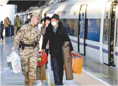 甘肃兰州,兰州西站,武警甘肃总队兰州支队捏勤官兵匡助老东说念主提行李。 吴代勇摄
