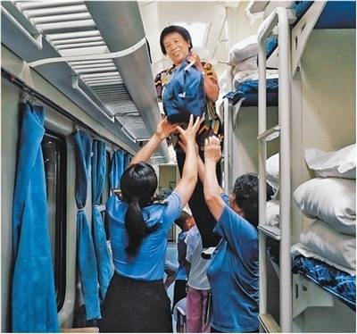 硬卧车厢内,列车职责主说念主员正协力匡助又名老年游客将行李摈弃到行李架上。 李倩倩摄
