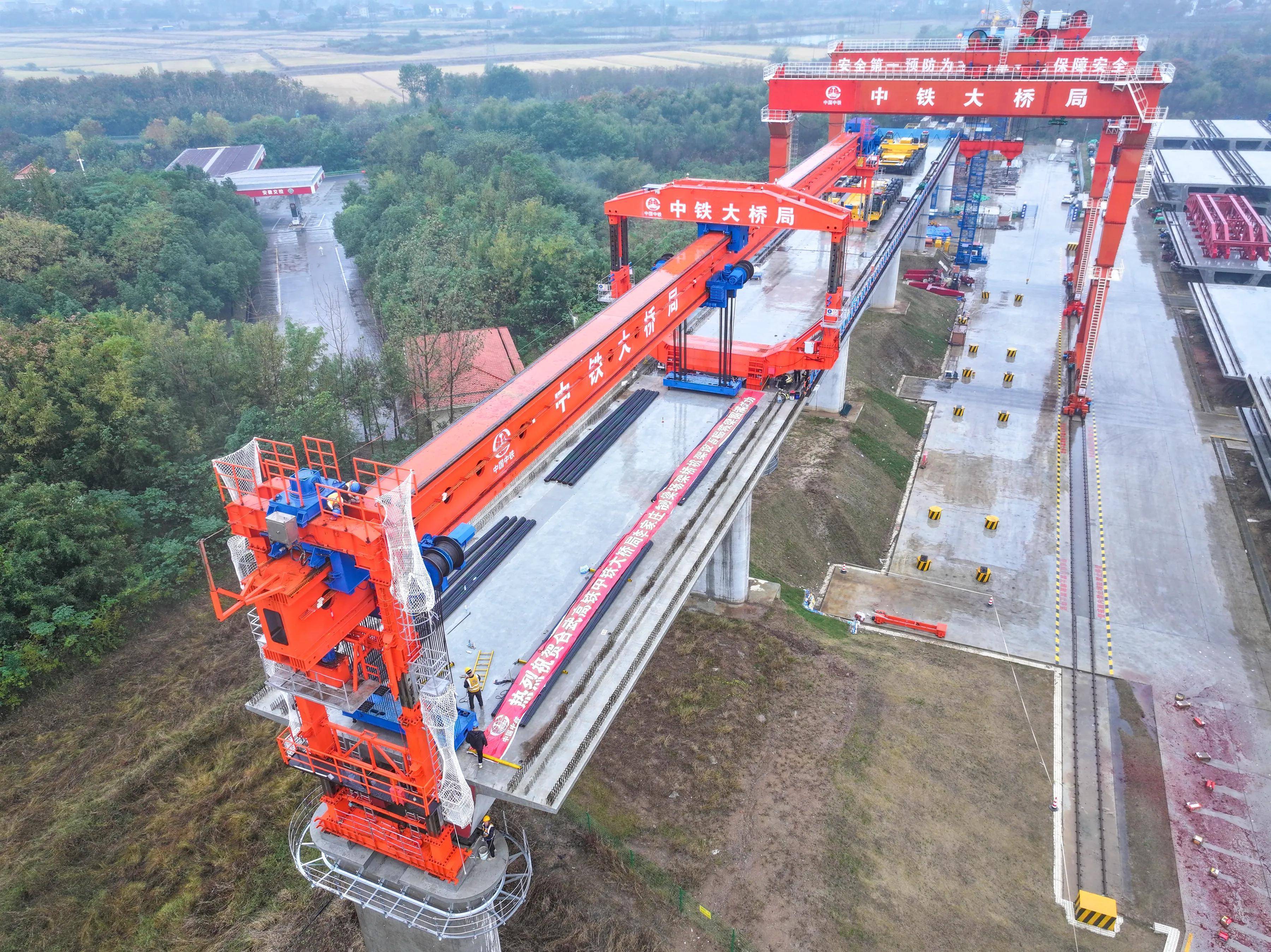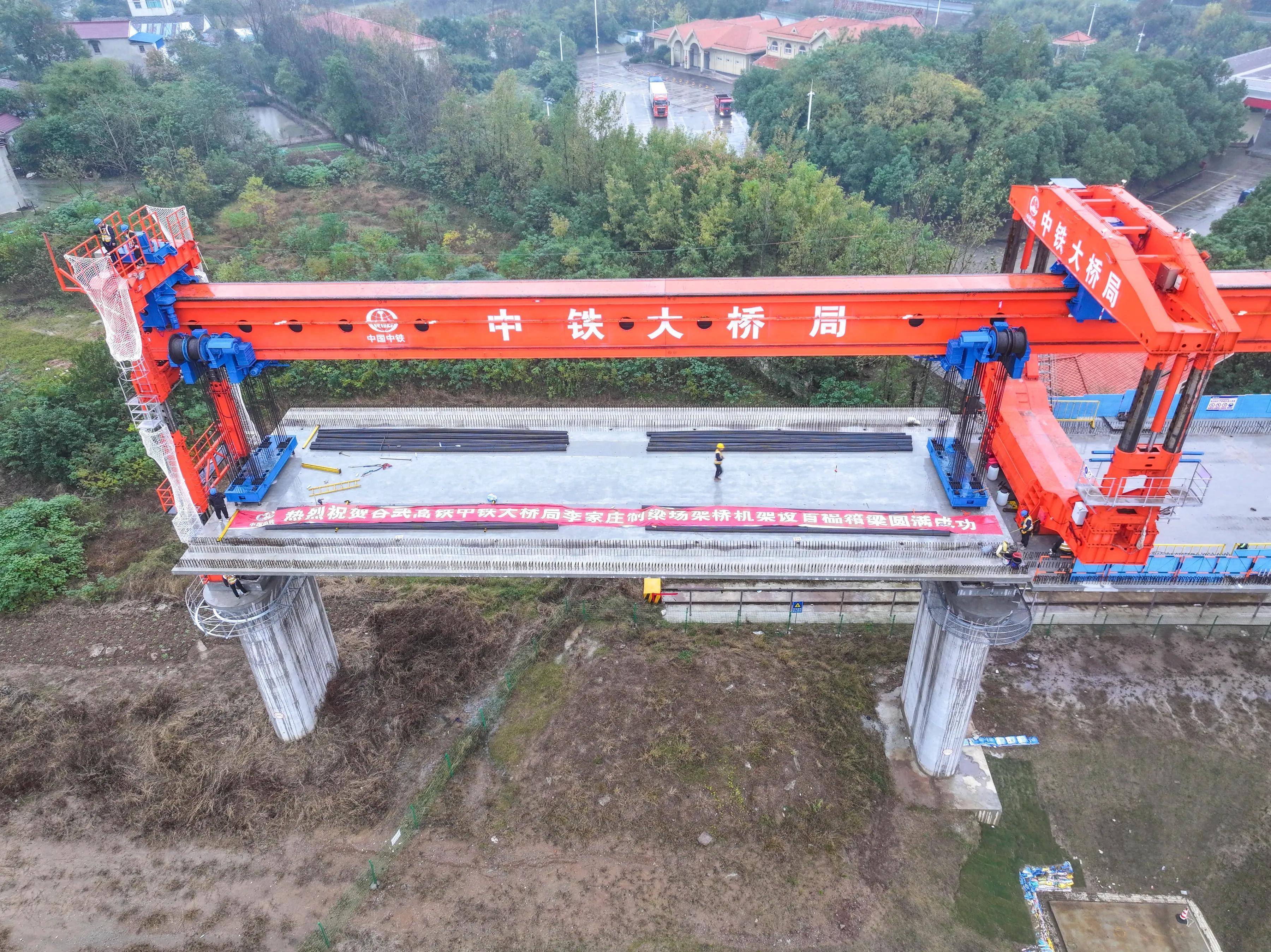 11月6日,在中铁大桥局李家庄梁场,经过架梁机2个小时的结协功课,一榀长32.6米的混凝土预制箱梁稳稳落在桥墩上,记号着合武高铁安徽段全线首榀箱梁架设完成。