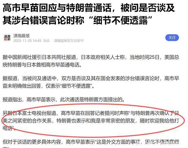 到底是特朗普的酬酢常用时间,仍是赈济高市早苗,只消特朗普本东谈主最了了,他吞吐认识、左右横跳的要领是有一手,根底猜不准。更为进击的,仍是特朗普的第二句话,要高市早苗随时和他通电话。 二、好意思国仍然执着亚洲 寰宇皆很了了高市最近在干什么事情,特朗普不例外。让高市早苗给他打电话,说什么?极大可能便是台湾现时的场面,特朗粗豪过高市早苗本东谈主获取台海场面的“第一手”谍报。这关于好意思国昔时在亚洲的布局十分进击。
